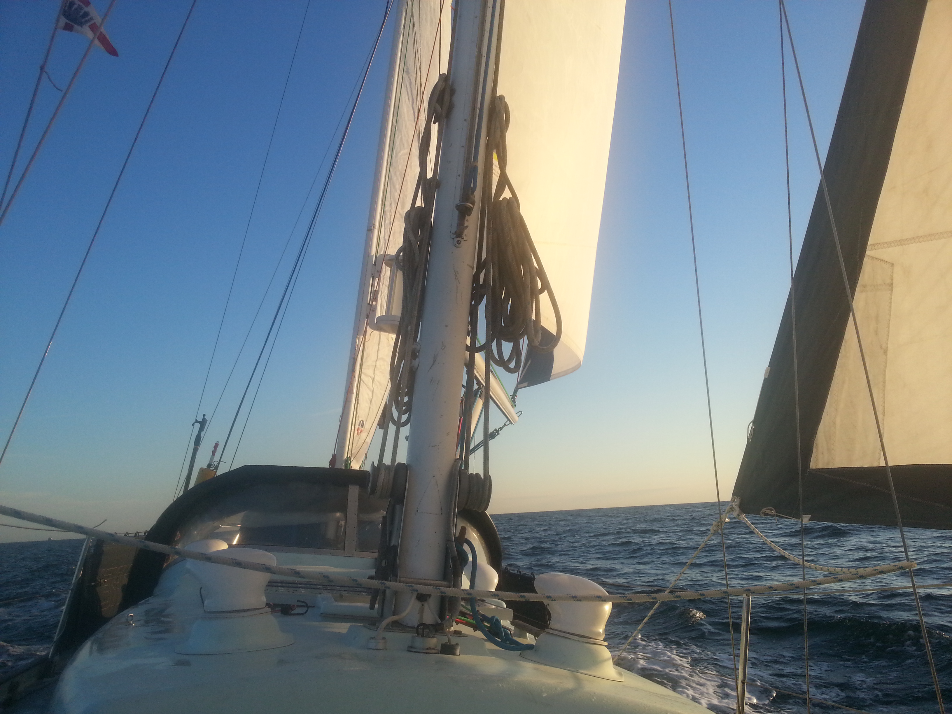 All went well, sails up we slowly started to gather pace. The distance was 136 nautical miles and by my reckoning this should take 28 hours. This meant that we would have 3 fair tides and 2 foul tide over this period and that by leaving at 1600hrs we would make the best of it although also meant passing the overfalls off the southern most point of the Isle of Wight during the hours of darkness. Also we would be passing the east and west entrances to the Solent in the dark as well.